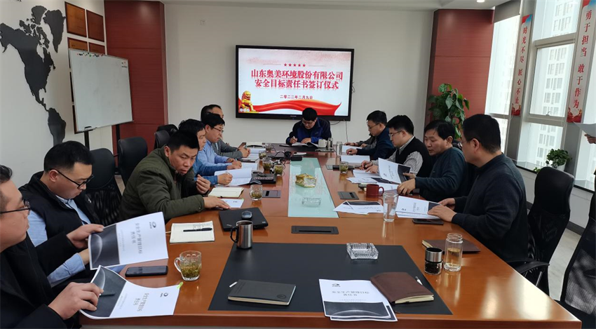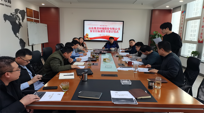 會議由公司安全生產部組織,公司領導班子及各部門負責人參加。尚瑞董事長宣讀《山東奧美環(huán)境安全生產承諾書》并帶頭在承諾書上簽字,竇大河總監(jiān)宣讀《山東奧美安全生產目標管理責任書》相關內容,強調公司安全、環(huán)保、職業(yè)衛(wèi)生否決指標,工作要求,獎懲辦法。馬總和李總以及各部門負責人簽訂責任書。